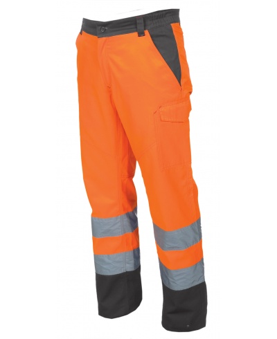 Men’s high visibility, two-tone winter trousers with reflective stripes, side elastic and waist belt loops. Zip fastening with plastic button, two classic front pockets, one LOCK SYSTEM side pocket, a tape measure pocket, two back pockets, one open and one with flap and Velcro. Contrasting stitching, triple seam crotch and inner leg