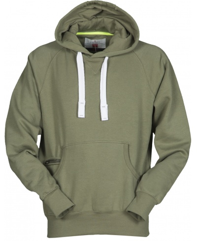 Men’s hoodie with double stitched seams and white drawstring with contrasting stitching and metal rings, raglan sleeves, V-design neck stitching, kangaroo pockets, small zip pocket, stretch rib cuffs and hem, reinforced seams
