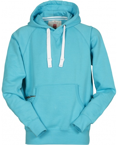 Men’s hoodie with double stitched seams and white drawstring with contrasting stitching and metal rings, raglan sleeves, V-design neck stitching, kangaroo pockets, small zip pocket, stretch rib cuffs and hem, reinforced seams