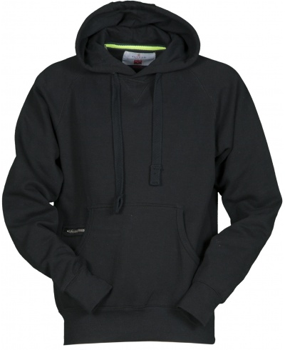 Men’s hoodie with double stitched seams and white drawstring with contrasting stitching and metal rings, raglan sleeves, V-design neck stitching, kangaroo pockets, small zip pocket, stretch rib cuffs and hem, reinforced seams