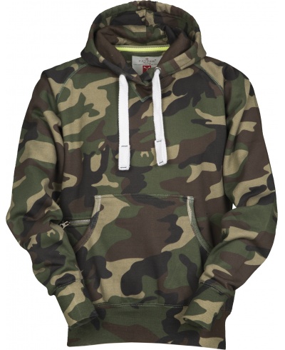 Men’s hoodie with double stitched seams and white drawstring with contrasting stitching and metal rings, raglan sleeves, V-design neck stitching, kangaroo pockets, small zip pocket, stretch rib cuffs and hem, reinforced seams