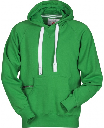 Men’s hoodie with double stitched seams and white drawstring with contrasting stitching and metal rings, raglan sleeves, V-design neck stitching, kangaroo pockets, small zip pocket, stretch rib cuffs and hem, reinforced seams