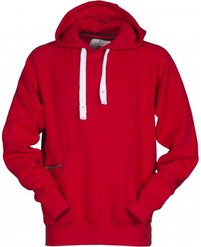 Men’s hoodie with double stitched seams and white drawstring with contrasting stitching and metal rings, raglan sleeves, V-design neck stitching, kangaroo pockets, small zip pocket, stretch rib cuffs and hem, reinforced seams