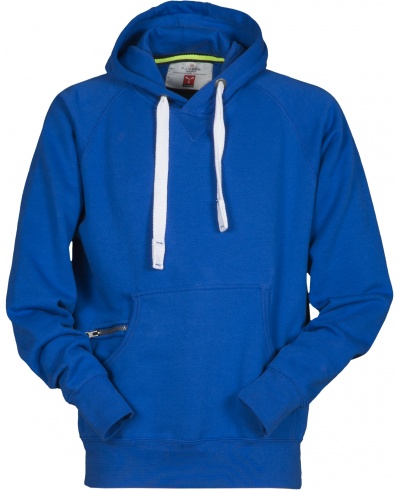 Men’s hoodie with double stitched seams and white drawstring with contrasting stitching and metal rings, raglan sleeves, V-design neck stitching, kangaroo pockets, small zip pocket, stretch rib cuffs and hem, reinforced seams