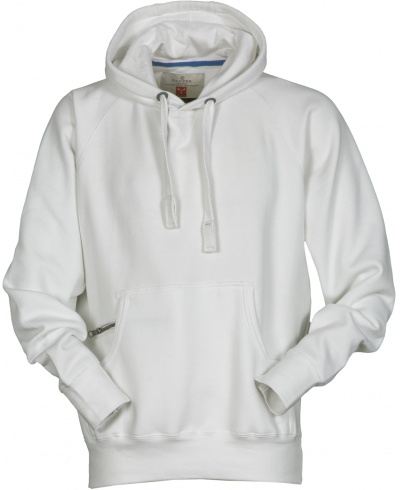 Men’s hoodie with double stitched seams and white drawstring with contrasting stitching and metal rings, raglan sleeves, V-design neck stitching, kangaroo pockets, small zip pocket, stretch rib cuffs and hem, reinforced seams