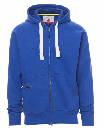 Men’s hoodie with full, plastic-covered SBS zip with double metal pull, hood with double stitched seams and white drawstring with contrasting stitching and metal rings, raglan sleeves, kangaroo pockets, small zip pocket, stretch rib cuffs and hem, reinforced seams