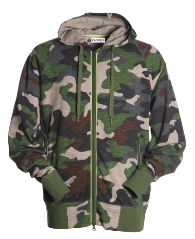 Men’s hoodie, full contrasting nylon zip, raglan sleeves, hood with contrasting colour drawstring, contrasting inner neck tape, stretch rib cuffs and hem and two front pockets with zip