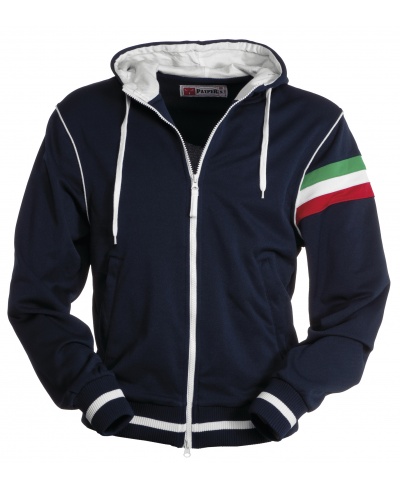 Men’s hoodie with full, contrasting plastic zip with double metal pull. Contrasting hood and drawstring, contrasting stretch rib cuffs and hem, contrasting cuff piping, trim (colours of the flag) on the left sleeve, 2 pockets with zip, reinforced seams and pique type fabric for greater breathability