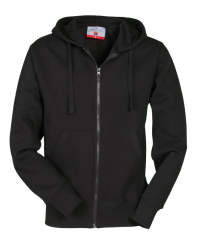 Men’s hoodie with full zip and matching colour hood, kangaroo pockets, reinforced seams, stretch rib cuffs and hem. Matching inner neck tape