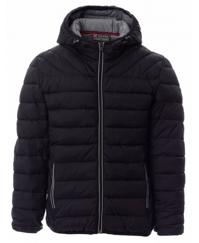 Men’s hooded lightweight jacket/down jacket, 5 mm plastic SBS zip with metal pull, thin-edge cuffs and hem, two outer pockets. Lining: feather-effect polyester padding, two pockets