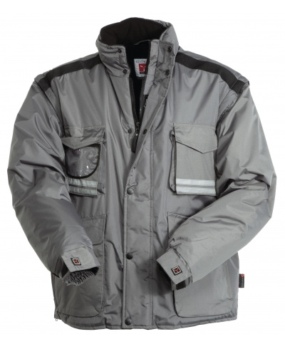 Men’s jacket with detachable sleeves, 8 mm plastic zip with metal pull, with flap fastening and plastic buttons, foldaway hood, adjustable cuffs, matching reflective stripes on the front and back, side vent with gusset and zip. Five outer pockets, one with a reversible badge holder. Padded, collar, back and lower back warmer in micro-fleece, breathable underarm inserts, inner drawstring and zip for easier printing and embroidery
