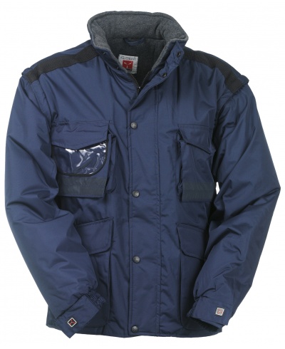 Men’s jacket with detachable sleeves, 8 mm plastic zip with metal pull, with flap fastening and plastic buttons, foldaway hood, adjustable cuffs, matching reflective stripes on the front and back, side vent with gusset and zip. Five outer pockets, one with a reversible badge holder. Padded, collar, back and lower back warmer in micro-fleece, breathable underarm inserts, inner drawstring and zip for easier printing and embroidery