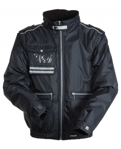 Men’s casual lightweight jacket with detachable sleeves, close fitting, plastic zip with metal pull, foldaway hood, rib hem, adjustable cuffs, shoulder tabs and zip-up collar, two LOCK SYSTEM pockets, two pockets with zip, one reversible badge holder pocket, reflex piping on the shoulders and two reflective stripes on the chest and back. Padded, high-density, silver coloured lining, micro-fleece back, fleece inside collar, one inner pocket
