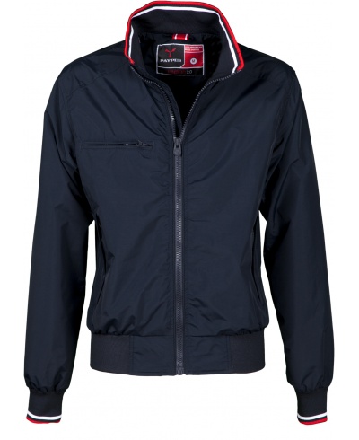 Men’s lightweight jacket, 8 mm plastic zip with metal pull, with collar, cuffs and hem in elastic rib with stripes, two outer pockets with plastic zip. Unpadded, mesh lining, one inner smartphone pocket with zip and opening for headphones, zip on the chest and back for easier printing and embroidery