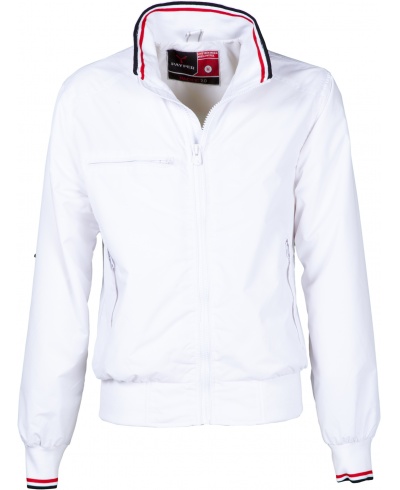 Men’s lightweight jacket, 8 mm plastic zip with metal pull, with collar, cuffs and hem in elastic rib with stripes, two outer pockets with plastic zip. Unpadded, mesh lining, one inner smartphone pocket with zip and opening for headphones, zip on the chest and back for easier printing and embroidery