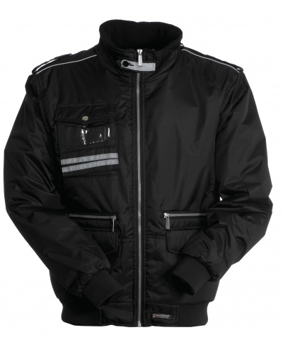 Men’s casual lightweight jacket, close fitting, plastic zip with metal pull, foldaway hood, rib hem and cuffs, shoulder tabs and zip-up collar, two LOCK SYSTEM pockets, two pockets with zip, one reversible badge holder pocket, reflex piping on the shoulders and two reflective stripes on the chest and back. Padded, high-density, silver coloured lining, micro-fleece back, fleece inside collar, one inner pocket