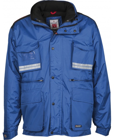 Four-use parka jacket, comprising: an outer, unpadded jacket, with nylon lining, collar, back and lower back warmer in micro-fleece and breathable underarm inserts, 8 mm plastic zip with metal pull, with flap fastening and plastic buttons, detachable and/or foldaway shaped hood, adjustable cuffs, grey reflective stripes on the front and back, pre-shaped elbows and side vent with gusset and zip, nine outer pockets, two with LOCK SYSTEM, two with zip and reinforced inner, one with a reversible badge holder, inner drawstring and zip for easier printing and embroidery. Lightweight jacket with detachable inner sleeves, padded, high-density lining and back in micro-fleece, foldaway hood, five pockets, one with reversible badge holder, neck fastening, reflex piping on the shoulders and double reflex insert on the chest and back, rib inside collar, one inner pocket
