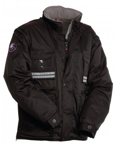 Men’s jacket with detachable sleeves, 8 mm plastic zip with metal pull, with flap fastening and plastic buttons, detachable and/or foldaway shaped hood, adjustable cuffs, grey reflective stripes on the front and back, pre-shaped elbows and side vent with gusset and zip, nine outer pockets, two with LOCK SYSTEM, two with zip and reinforced inner, one with a reversible badge holder. Padded, micro-fleece inside collar, back and lower back warmer, breathable underarm inserts, inner drawstring and zip for easier printing and embroidery
