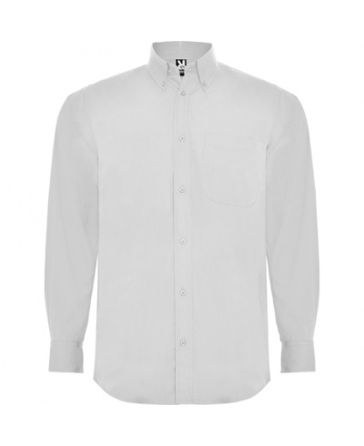 Long sleeve shirt and classical starched collar with 1 button. Left front pocket, flap with 7 matching buttons and curved hem. Easy care.