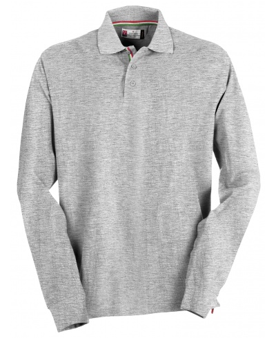 Men’s long-sleeved polo shirt with 3, matching, mother-of-pearl effect buttons, matching collar, with contrasting underside (colours of the flag). Inner button flap and side vents with colours of the flag, rib collar and sleeve edging, concealed collar stitching, side reinforcement tape, inner neck tape
