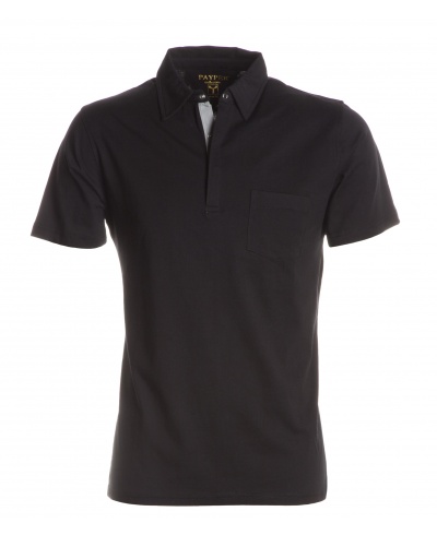 Men’s short-sleeved polo shirt with three, snap fasteners, low neck, pocket, shirt-style jersey collar, transfer label, inner neck tape