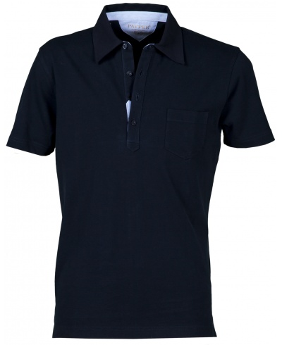 Men’s short-sleeved polo shirt with 4, matching, mother-of-pearl effect buttons, shirt-style pique collar, pocket and light blue poplin inserts on the inside collar, opening and side vents, transfer label, inner neck tape