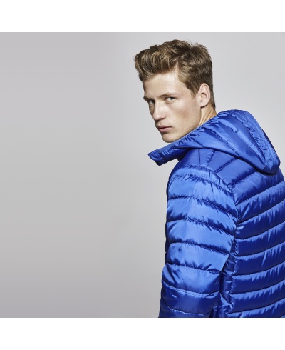 Men´s quilted jacket feathery to the touch with fitted hood.