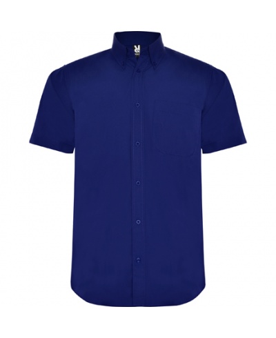 Short sleeve shirt and classical starched collar with 1 button. Left front pocket, flap with 7 matching buttons and curved hem. Easy care.