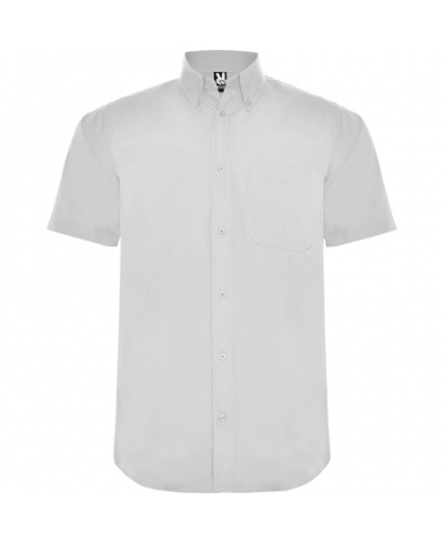 Short sleeve shirt and classical starched collar with 1 button. Left front pocket, flap with 7 matching buttons and curved hem. Easy care.