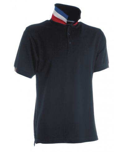 Men’s short-sleeved polo shirt with 3, matching, mother-of-pearl effect buttons, matching collar with contrasting underside (colours of the flag). Right sleeve edging with colour trim (same colour as collar), rib collar and sleeve edging, side vent trim with colours of the flag, concealed collar stitching with jersey tape (colours of the flag), side reinforcement tape, inner neck tape