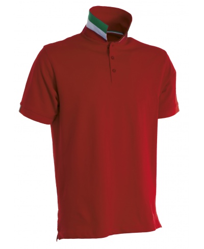 Men’s short-sleeved polo shirt with 3, matching, mother-of-pearl effect buttons, matching collar with contrasting underside (colours of the flag). Right sleeve edging with colour trim (same colour as collar), rib collar and sleeve edging, side vent trim with colours of the flag, concealed collar stitching with jersey tape (colours of the flag), side reinforcement tape, inner neck tape