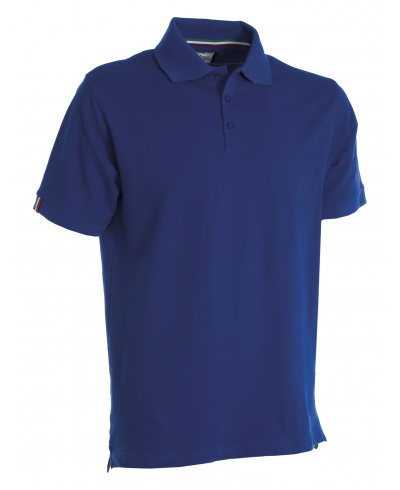 Men’s short-sleeved polo shirt with 3, matching, mother-of-pearl effect buttons, matching collar with contrasting underside (colours of the flag). Right sleeve edging with colour trim (same colour as collar), rib collar and sleeve edging, side vent trim with colours of the flag, concealed collar stitching with jersey tape (colours of the flag), side reinforcement tape, inner neck tape