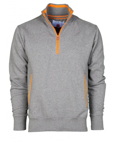 Sweatshirt with half zip in contrasting coloured plastic with metal pull, contrasting trim on the collar and side pockets; stretch rib collar, cuffs and hem, reinforced seams