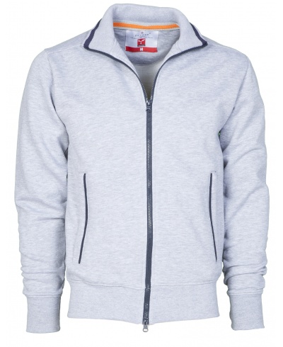 Men’s sweatshirt with full, contrasting coloured plastic SBS zip with double metal pull; rib collar with contrasting trim, side pockets with contrasting trim, fitted sleeves, two outer pockets with contrasting zip, stretch rib cuffs and hem, reinforced seams