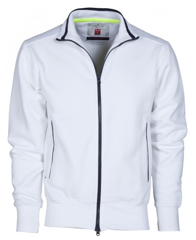 Men’s sweatshirt with full, contrasting coloured plastic SBS zip with double metal pull; rib collar with contrasting trim, side pockets with contrasting trim, fitted sleeves, two outer pockets with contrasting zip, stretch rib cuffs and hem, reinforced seams