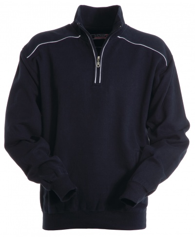 Sweatshirt with half zip in plastic with metal pull, contrasting trim on the shoulders, zip edge and back; two zip pockets, stretch rib cuffs and hem