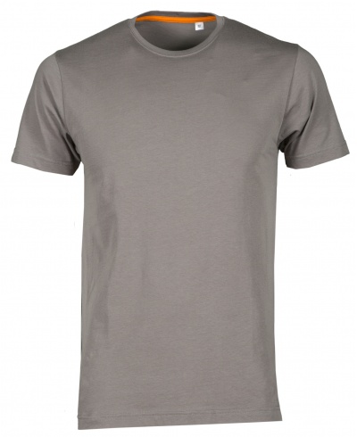 Men’s short-sleeved crew neck t-shirt, with 1.5 cm spandex mix rib neckband with top stitching on the front, contrasting shoulder-to-shoulder reinforcement tape visible on the inside collar, stretch seams, side seams, no label