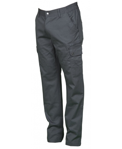 Men’s lined winter trousers, side elastic and waist belt loops, zip fastening with metal button, two classic front pockets, two side pockets with flaps and snap fasteners, one left pocket with zip, one foldaway tape measure pocket on the right, two slit back pockets with button and buttonhole