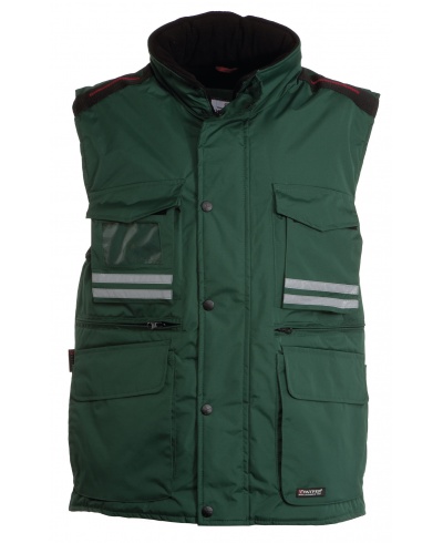 Men’s vest, 8 mm plastic zip with metal pull, with flap fastening and plastic buttons, detachable and/or foldaway shaped hood, grey reflective stripes on the front and back, side vent with gusset and zip, nine outer pockets, two with LOCK SYSTEM, two with zip and reinforced inner, one with a reversible badge holder. Padded, collar, back and lower back warmer in micro-fleece, inner drawstring and zip for easier printing and embroidery