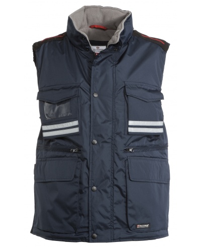 Men’s vest, 8 mm plastic zip with metal pull, with flap fastening and plastic buttons, detachable and/or foldaway shaped hood, grey reflective stripes on the front and back, side vent with gusset and zip, nine outer pockets, two with LOCK SYSTEM, two with zip and reinforced inner, one with a reversible badge holder. Padded, collar, back and lower back warmer in micro-fleece, inner drawstring and zip for easier printing and embroidery