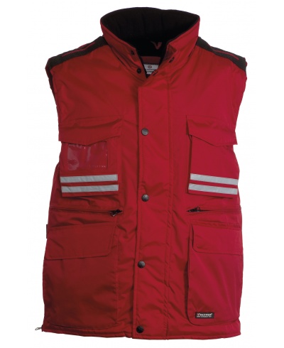 Men’s vest, 8 mm plastic zip with metal pull, with flap fastening and plastic buttons, detachable and/or foldaway shaped hood, grey reflective stripes on the front and back, side vent with gusset and zip, nine outer pockets, two with LOCK SYSTEM, two with zip and reinforced inner, one with a reversible badge holder. Padded, collar, back and lower back warmer in micro-fleece, inner drawstring and zip for easier printing and embroidery