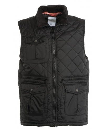 Men’s quilted vest, 8 mm plastic zip with metal pull, side vents with button, five outer pockets, two with LOCK SYSTEM. Padded, corduroy rib inside collar, one inner pocket