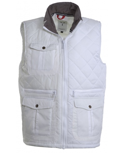 Men’s quilted vest, 8 mm plastic zip with metal pull, side vents with button, five outer pockets, two with LOCK SYSTEM. Padded, corduroy rib inside collar, one inner pocket