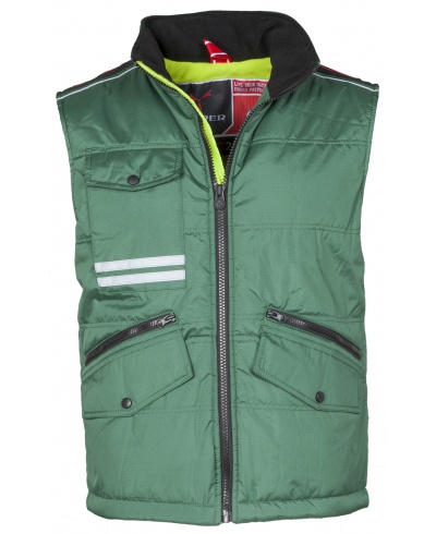 Men’s fitted vest, zip, two LOCK SYSTEM outer pockets, two pockets with zip, slanting pockets for easier access, one smartphone breast pocket and badge holder ring, reflective stripes on the pocket and back; padded, contrasting fleece lining on the back and collar, one inner pocket, zip for easier printing and embroidery