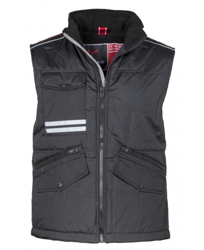 Men’s fitted vest, zip, two LOCK SYSTEM outer pockets, two pockets with zip, slanting pockets for easier access, one smartphone breast pocket and badge holder ring, reflective stripes on the pocket and back; padded, contrasting fleece lining on the back and collar, one inner pocket, zip for easier printing and embroidery
