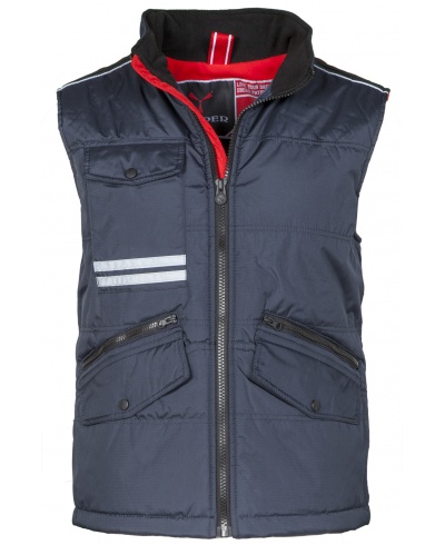 Men’s fitted vest, zip, two LOCK SYSTEM outer pockets, two pockets with zip, slanting pockets for easier access, one smartphone breast pocket and badge holder ring, reflective stripes on the pocket and back; padded, contrasting fleece lining on the back and collar, one inner pocket, zip for easier printing and embroidery