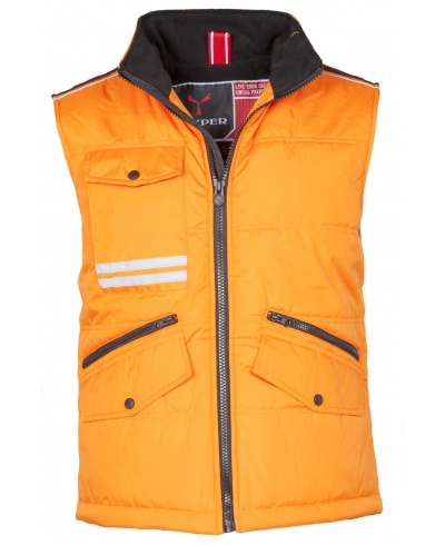 Men’s fitted vest, zip, two LOCK SYSTEM outer pockets, two pockets with zip, slanting pockets for easier access, one smartphone breast pocket and badge holder ring, reflective stripes on the pocket and back; padded, contrasting fleece lining on the back and collar, one inner pocket, zip for easier printing and embroidery