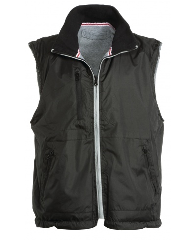 Reversible men’s vest, plastic zip with reflex profile, drawstring waist, three outer pockets. Fleece lining, rib knit inside collar, two breast pockets and chest zip for easier printing and embroidery