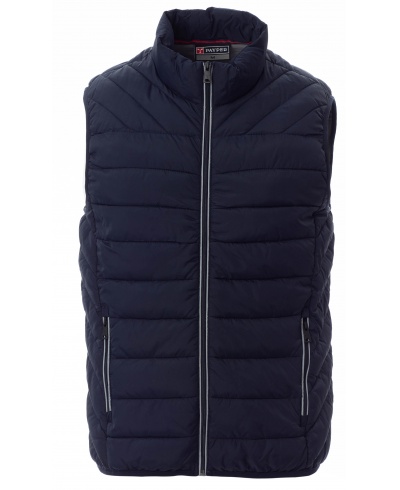 Men’s vest/down jacket, 5 mm plastic SBS zip with metal pull, thin-edge hem, two outer pockets. Lining: feather-effect polyester padding, two pockets