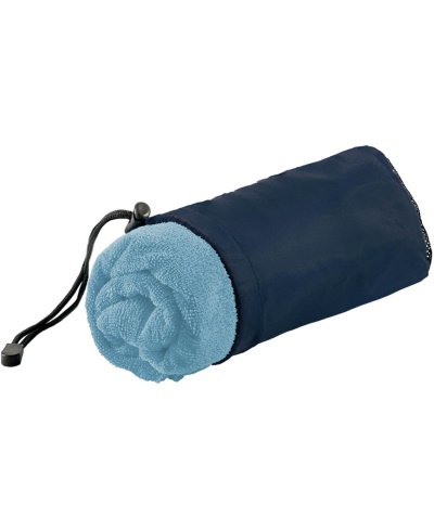80% polyester / 20% polyamide. Light weight towel for ultra-fast drying. Overlocked seams. Contrast zipped pocket at lower corner. Polyamide color coordinated carry pouch with elasticated drawstring and meshed bottom for ventilation (color Soft Blue: pocket in contrasting Navy). Pocket size: 25 cm. Size: 100 x 50 cm